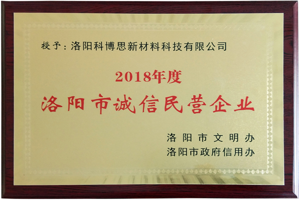 近日,由市文明辦與市政府信用辦舉辦的《洛陽市2018年度“誠信經(jīng)營企業(yè)”和“誠信建設(shè)先進個人”評選活動》,經(jīng)推薦遴選和嚴格評審,洛陽科博思新材料科技有限公司被授予“誠信民營企業(yè)”榮譽稱號。