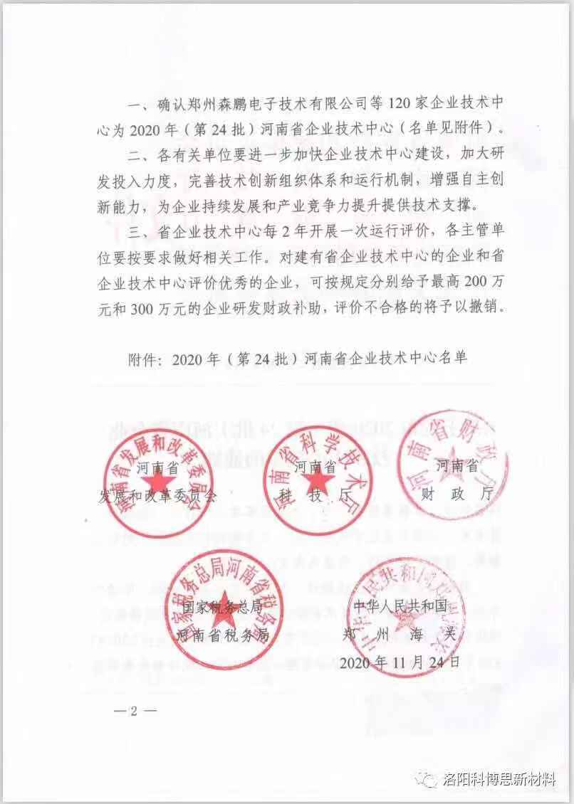 近日,河南省發展和改革委員會下發了《關于發布2020年(第24批)河南省企業技術中心名單的通知》(豫發改高技〔2020〕919號),經過評審、考察、公示等環節,洛陽科博思新材料科技有限公司從全省多家企業脫穎而出,順利通過第24批省級企業技術中心認定,這是公司在2018年被認定為洛陽市企業技術中心后的又一突破。